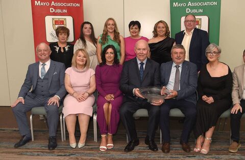 Pictured in the Clayton Hotel Burlington Road in Dublin last month was Noel Howley, Chairperson, Mayo Association Dublin, presenting the Meitheal Award 2025 to John Gallagher and the staff from Solas Visitor Experience and Tourism Hub in Eachléim, Belmullet. Picture: Conor McKeown