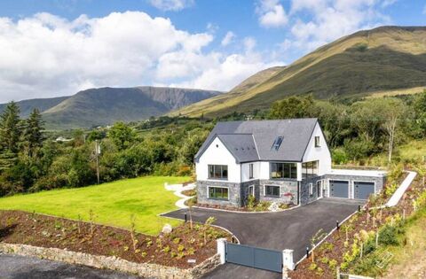 The property is a stunning and contemporary six-bedroom split-level residence set on an elevated site in the heart of the Partry Mountains, overlooking Lough Mask.