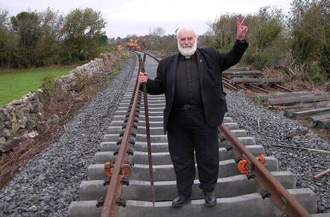 Fr Micheál MacGreil pictured on the rail- ine near Craughwell in Co Galway in 2007. The renowned priest campaigned for 40 years for the re-opening of the Western Rail Corridor.