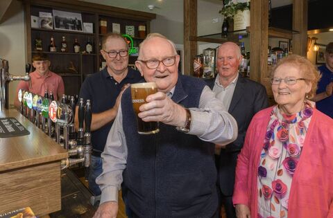 Retired publican Eamonn Munnelly Snr, aged 92, pours the first pint in the new High Chaparral – a moment he thought he would never see again. Picture: Michael McLaughlin