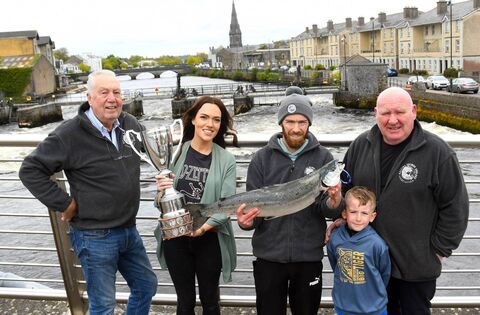 First River Moy salmon was caught by Ballina native Nigel Lackey at Ballina Salmon Weir Sunday 28th. Left to right with Peter McHugh Ballina Salmon Anglers Association, Andrea Murray presents the Davy Murray Cup to Nigel Lackey with the first Moy Salmon of 2024 weighing in at 11pounds, Lucas Lackey and Frances Gorman Chairperson Ballina Salmon Anglers Association. Picture: John O'Grady.