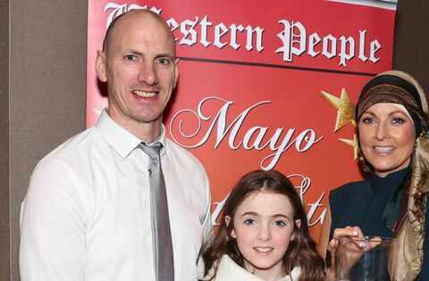Community Award recipient Rita Casey from Charlestown pictured with husband John and daughter Jenna Eve at Friday night's Mayo Sports Stars Awards. Picture: Michael Donnelly
