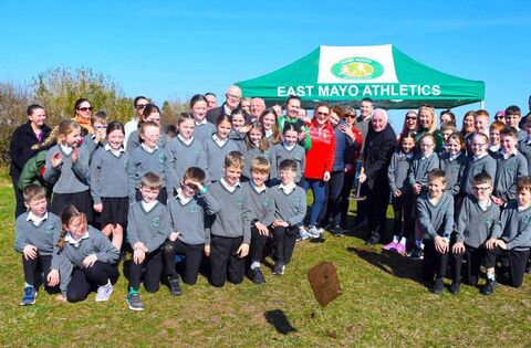 Fr Tommy Johnson turns the sod for East Mayo Athletics Club's new running track in Charlestown. Also pictured are committee members of the club and students from St Attracta's National School. Picture: John O'Grady
