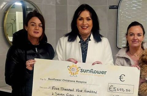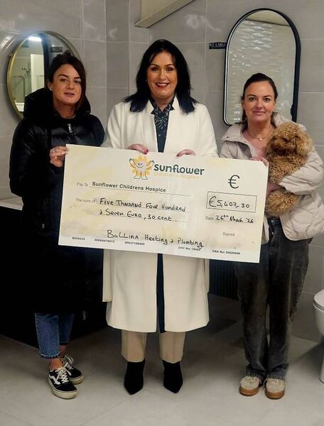 Elaine Clarke, Martina Jennings, Joanne Clarke and her pet Penny, pictured at the cheque presentation to Mayo Roscommon Hospice of €5,407 from the very successful recent fundraiser, to mark the 40th anniversary of Ballina Heating and Plumbing Supplies Ltd.