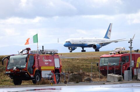Air Force One, carrying US President Joe Biden, arrives at Ireland West Airport Knock on April 14, 2023. Picture: Julien Behal/Irish Government via Getty Images