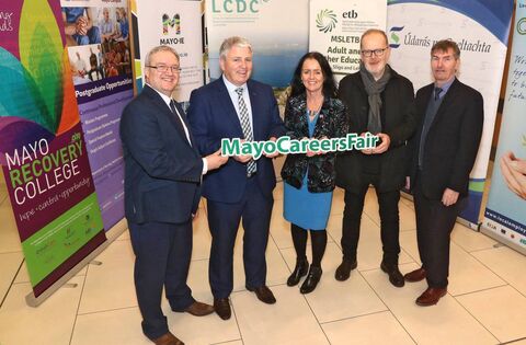 Pictured launching the last in-person Mayo Careers Fair in 2020 were, from left: Michael Gill, Pat Howley MSLETB, Anne Ronayne Mayo County Council, Donal Hoban HSE and Cllr Al McDonnell.