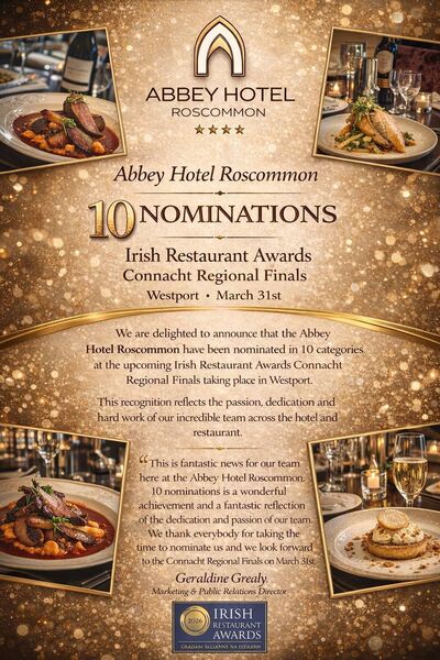 The 4* Abbey Hotel Roscommon is celebrating after receiving an impressive 10 nominations ahead of this year’s Irish Restaurant Awards Connacht Regional Finals, which will take place at Knockranny House Hotel in Westport on Tuesday, March 31st.