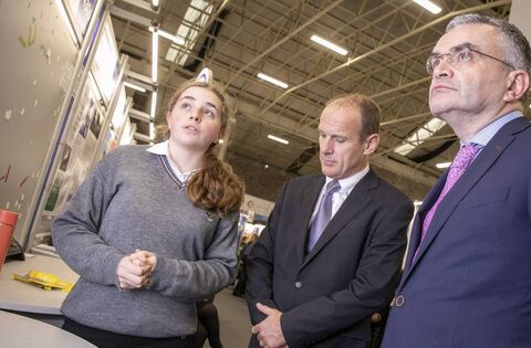 Orlaith Heaney, a student at Mount St Michael, presenting her project 'STIGMA' to Peter Evans, BT Ireland, and Minister of State Dara Calleary TD