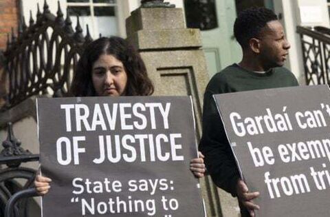 About 40 people gathered and held signs with slogans such as “Justice for George Nkencho”, “Gardai can’t be exempt from trial” and “travesty of justice”.