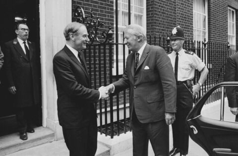 Taoiseach Liam Cosgrave became Taoiseach in 1973, ending 16 years of Fianna Fáil in government. He is pictured (left) shaking hands with British Prime Minister Edward Heath outside Number 10 Downing Street prior to talks on July 3, 1973. Picture: McCarthy/Daily Express/Hulton Archive/Getty Images