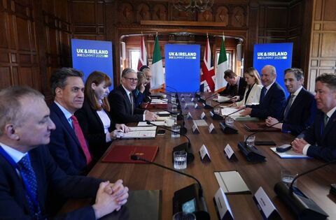 Pictured during the UK-Ireland Summit 2025 at Inglewood Manor House in Ellesmere Port, Liverpool, last Thursday were, from second left: UK Energy Security and Net Zero Secretary Ed Miliband; UK Deputy Prime Minister Angela Rayner; UK Prime Minister Sir Keir Starmer; UK Home Secretary Yvette Cooper; Northern Ireland Secretary Hilary Benn; British Ambassador to Ireland Paul Johnston (hidden); Irish ambassador to the UK Martin Fraser; Minister for Justice, Home Affairs and Migration Jim O'Callaghan; Minister for Education and Youth Helen McEntee; Taoiseach Micheal Martin; Tánaiste and Minister for Foreign Affairs and Minister for Defence Simon Harris; Minister for Climate, Environment, Energy and Minister for Transport Darragh O'Brien. Picture: Peter Byrne - WPA Pool/Getty Images
