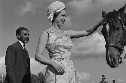 Queen Elizabeth II patting on the forehead of a horse while Ethiopian emperor Haile Selassie is standing next to her during her visit to Ethiopia in 1965. Picture: Terry Fincher/Daily Express/Hulton Archive/Getty Images