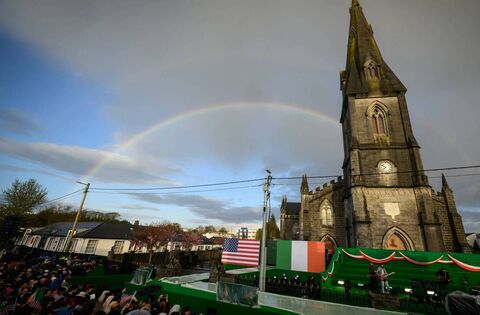 A rainbow appears over the stage during the concert ahead of US President Joe Biden's speech at St Muredach's Cathedral in Ballina on April 14, 2023. Picture: Leon Neal/Getty Images