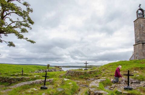 The Prior of Lough Derg, Father Laurence (La) Flynn, prays at the penitential beds where pilgrims come to pray at St Patrick's Purgatory on Lough Derg, during the Covid-19 lockdown in July 2020. Picture: Paul Faith/AFP via Getty Images
