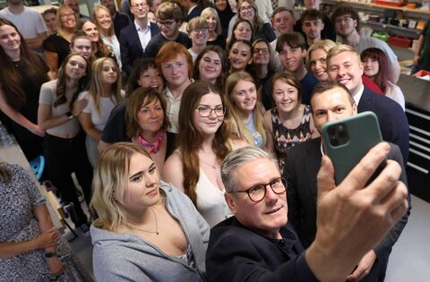 Labour leader Keir Starmer takes a group photo with students on a mobile phone as he visits Burton and South Derbyshire College during the final week of campaigning in the British general election. Picture: Cameron Smith/Getty Images
