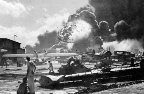 An explosion at the Naval Air Station, Ford Island, Pearl Harbour during the Japanese attack in World War II. Picture: Fox Photos/Getty Images