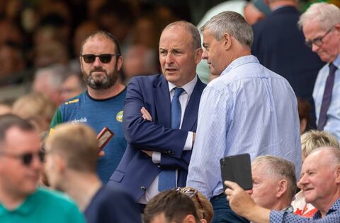 Taoiseach Micheal Martin in conversation beforee the All-Ireland SFC Final between Kerry and Donegal at Croke Park. Picture: INPHO/Morgan Treacy