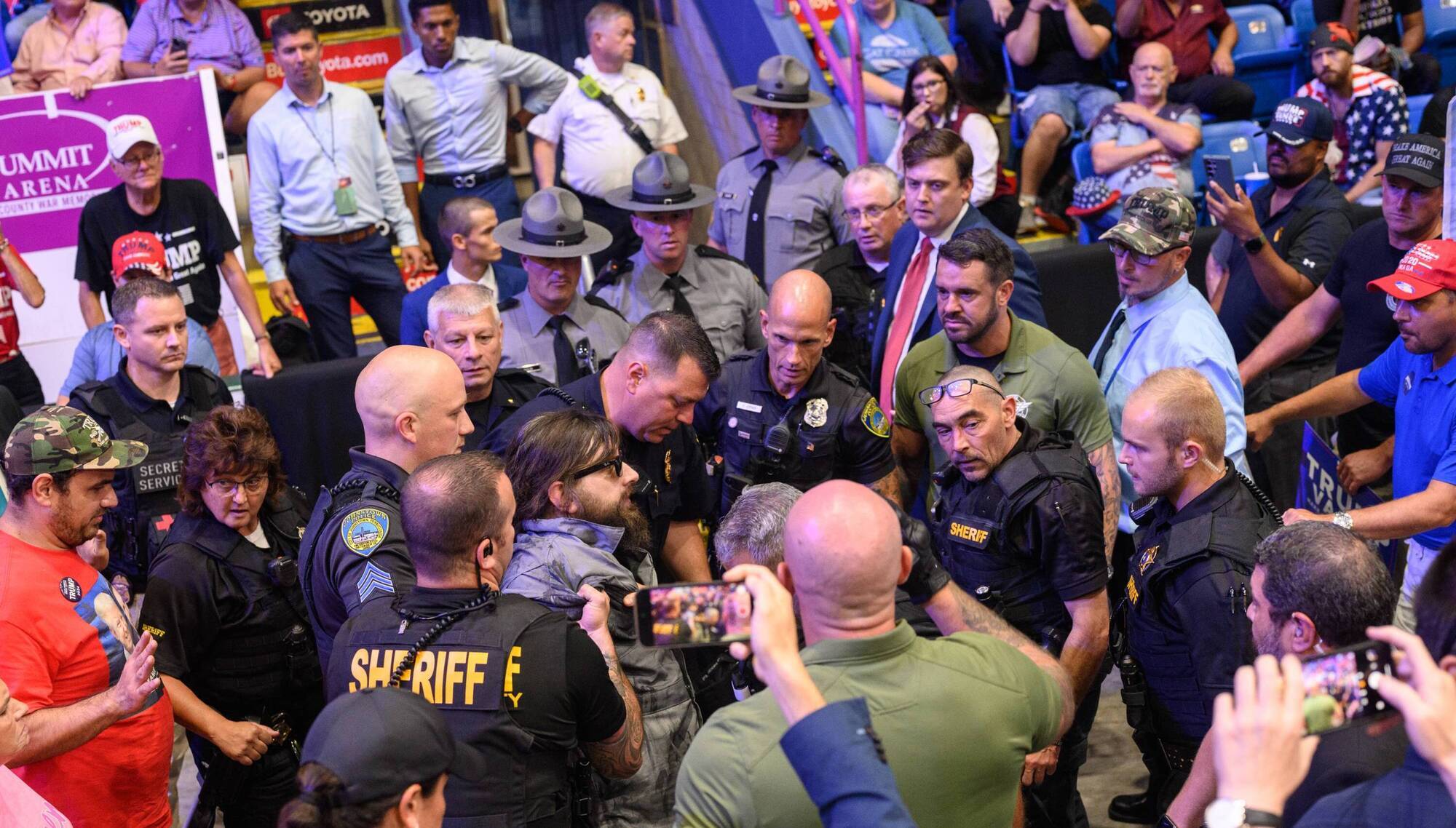 A man is apprehended by security and police after jumping onto the media platform at a campaign rally for Republican presidential nominee, former U.S. President Donald Trump in Johnstown, Pennsylvania on August 30. Picture: Justin Merriman/Getty Images
