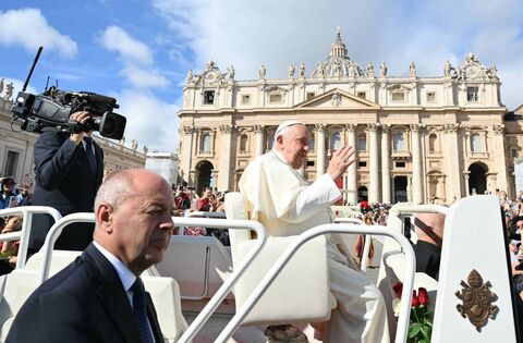 Pope Francis greets the crowd at the end of a mass for the opening of the Ordinary General Assembly of the Synod of Bishops, last Wednesday at St Peter's Square in The Vatican. Picture: Alberto Pizzoli/AFP via Getty Images
