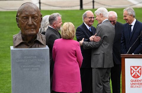 Senator George Mitchell, Bill Clinton, Bertie Ahern and Tony Blair are pictured in 2023 at the unveiling of a bust of Senator Mitchell at Queens University Belfast, honouring his work in relation to the Good Friday Agreement. Picture: Charles McQuillan/Getty Images