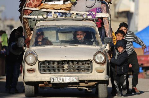 Palestinian children help push a car as people leave their homes with their belongings after receiving evacuation orders from the Israeli military, at the Bureij refugee camp in the central Gaza Strip on December 18, 2024. Picture: Eyad Baba/AFP via Getty Images