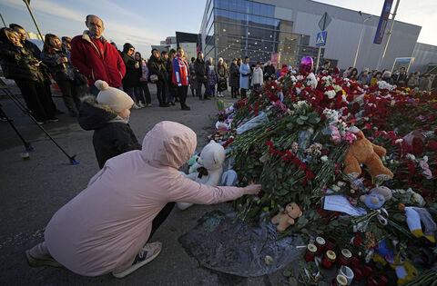 People lay flowers at a makeshift memorial in front of the Crocus City Hall on the western outskirts of Moscow, Russia, after the recent terrorist attack. Picture: AP Photo/Alexander Zemlianichenko