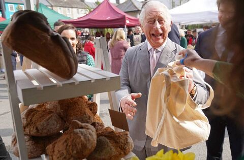 The then Prince Charles buys a loaf of soda bread during a visit to Cahir Farmers' Market in Co Tipperary on March 25, 2022. Picture: Brian Lawless/AFP via Getty Images