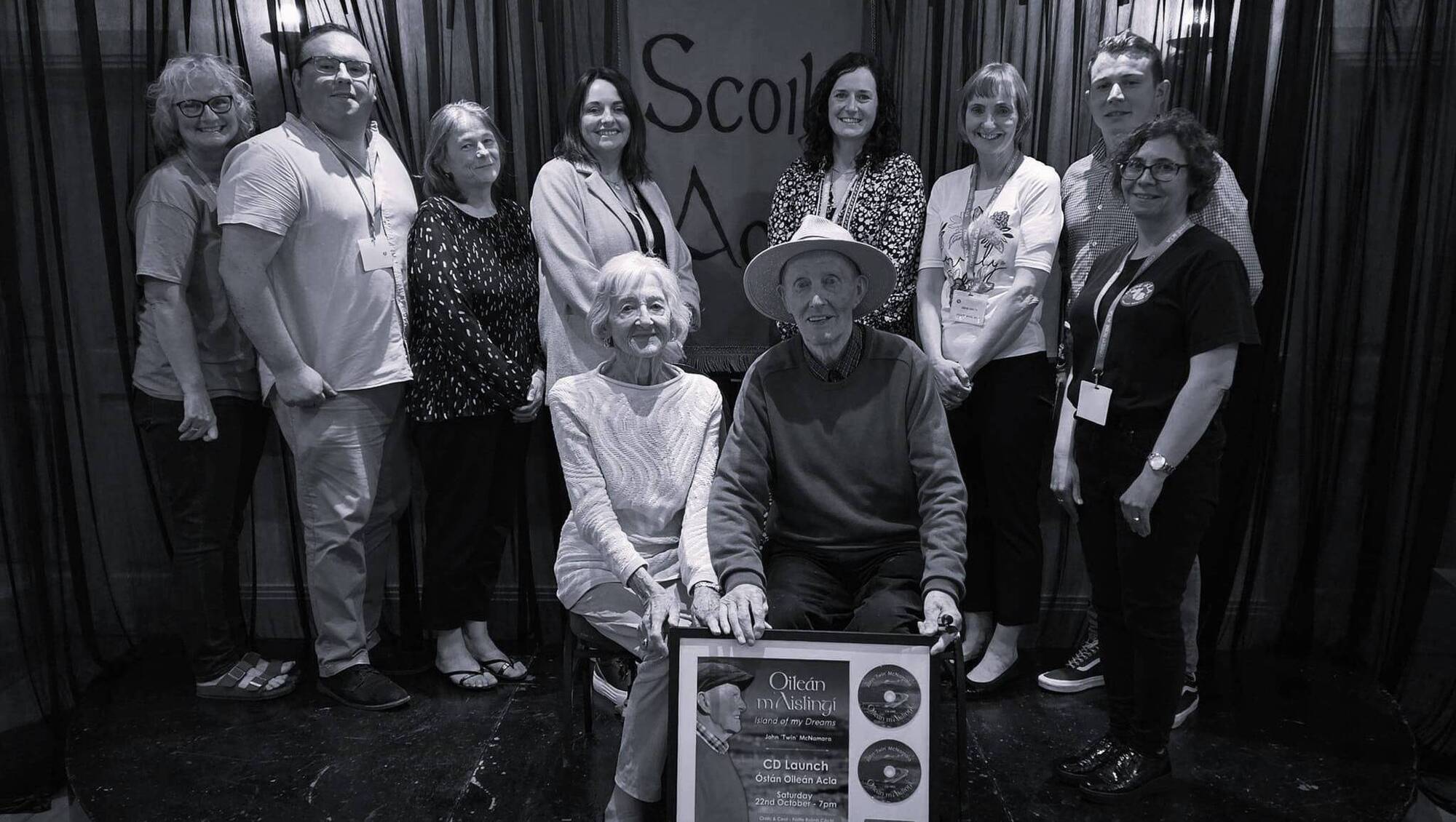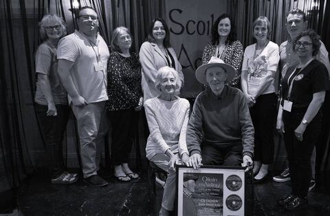The late John ‘Twin’ McNamara and his wife Mary pictured with the committee of Scoil Acla, who presented him with a framed CD and booklet of his song collection, 'Oileán m’Aislingí', taken at a recognition night in his honour during Scoil Acla’s Scoil Samhraidh 2023. Picture: courtesy of Scoil Acla