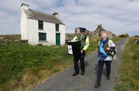 Presiding Officer Carmel McBride and Garda Adrian McGettigan carry a ballot box to the polling station on the island of Inishbofin, off Co Donegal, in 2019. Picture: Niall Carson/PA Wire