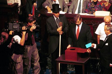 Massachusetts Secretary of State William Galvin opens the ballot box on December 18, 2000, as Massachusetts Electoral College president Robert E. Colt casts his vote at the State House in Boston, MA. The Massachusetts Electoral College delegates cast their votes for Vice-President Al Gore in the 2000 presidential election, which was narrowly won by Republican George W. Bush. Gore was the last sitting vice-president before Kamala Harris to run for president. Picture: Darren McCollester/Newsmakers