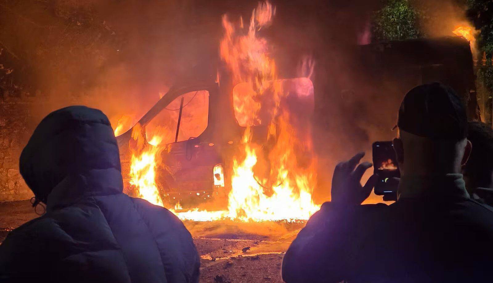 A garda van was set on fire during the recent anti-immigration riots at Citywest in Dublin. Picture: courtesy of The Irish Times