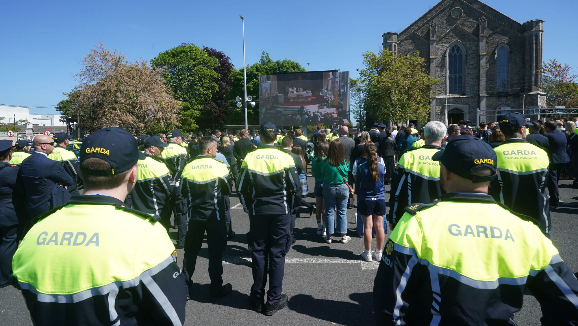 Members of the public and gardai watch the funeral service of Garda Kevin Flatley on a screen outside St Peter and Paul's Church, Balbriggan, Co Dublin, last May. Picture: Brian Lawless/PA Wire