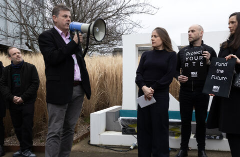 Kevin Bakhurst, the Director General of RTÉ, addresses staff members during their lunchtime picket at Montrose last Wednesday over the ongoing issues at the station.