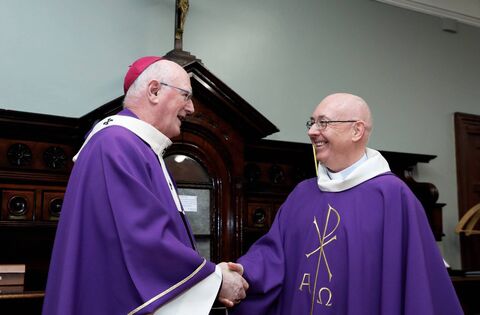 Fr Donal Roche (right) is congratulated by Archbishop Dermot Farrell after he was appointed Auxiliary Bishop of the Archdiocese of Dublin last year. Picture: John McElroy