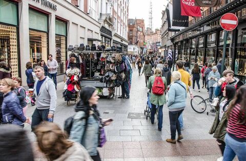 Crowds of people walk on Grafton Street in Dublin, the capital city's main shopping thoroughfare.
