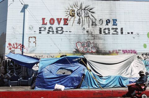 A person passes an encampment of homeless people in the Skid Row community in Los Angeles, California earlier this year. Picture: Mario Tama/Getty Images