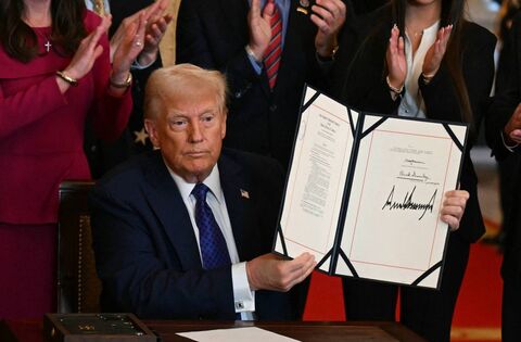 US President Donald Trump poses after signing the Laken Riley Act in the East Room of the White House last January. The Act mandates the detention of undocumented immigrants charged with theft-related crimes and was named in memory of a 22-year-old student murdered by a Venezuelan man with no papers who was wanted for shoplifting. Picture: AFP via Getty Images)