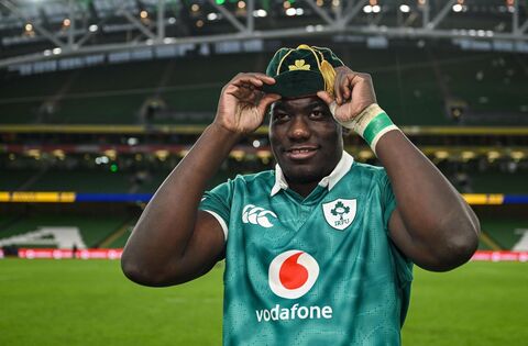 Edwin Edogbo of Ireland with his first cap after the Guinness Six Nations Rugby Championship match between Ireland and Italy at the Aviva Stadium in Dublin. Picture: Brendan Moran/Sportsfile