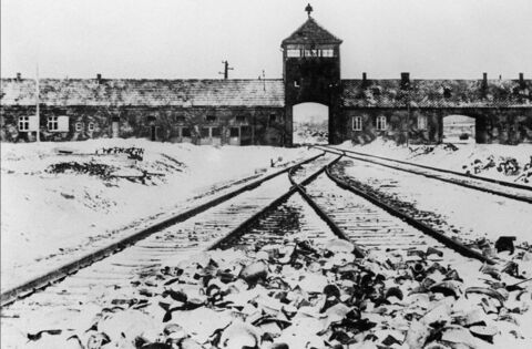 A picture taken in January 1945 depicts Auschwitz concentration camp gate and railways after its liberation by Soviet troops. Picture: Yad Vashem/AFP via Getty Images