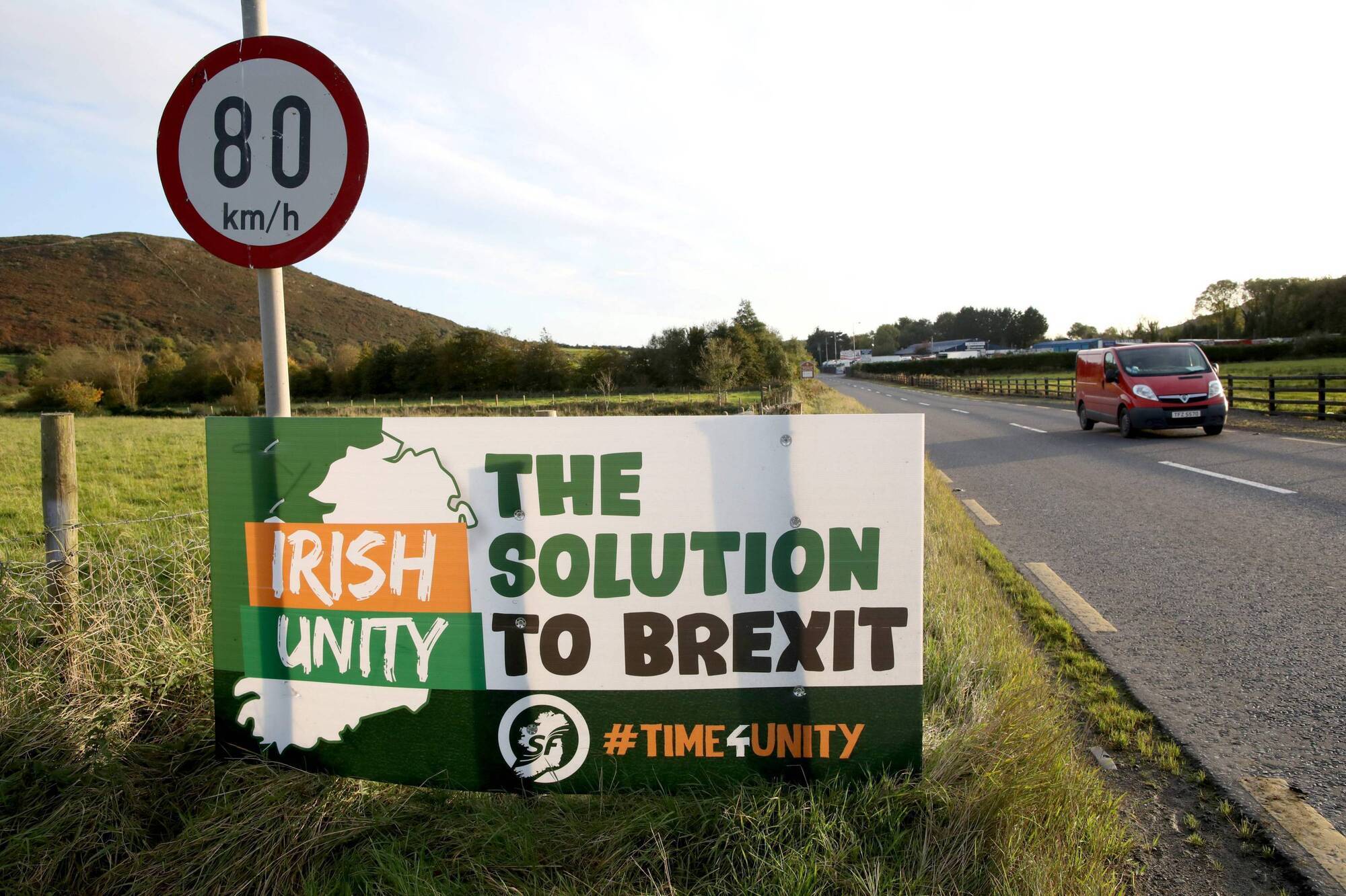 Motorists pass an anti-Brexit Irish Unity banner as they drive in Dundalk in October 2019. Picture: Paul Faith/AFP via Getty Images