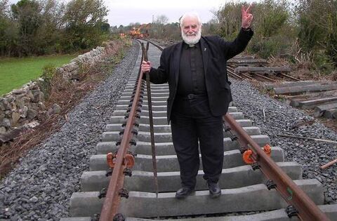 Fr Micheál Mac Greil pictured on the rail-line near Craughwell in Co Galway in 2007. The renowned priest campaigned for 40 years for the re-opening of the Western Rail Corridor.