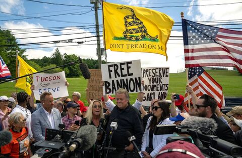 Steve Bannon, the former Donald Trump White House strategist, addresses the media at the Federal Correctional Institution Danbury, Connecticut on July 1 before beginning his four-month prison sentence for contempt of Congress. Picture: David Dee Delgado/Getty Images