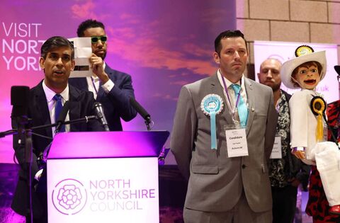 Independent candidate Niko Omilana (back) holds an 'L' behind outgoing Prime Minister Rishi Sunak as he delivers a speech next to Reform UK candidate Lee Martin Taylor, Yorkshire Party candidate Rio Goldhammer and Sir Archibald Stanton of The Official Monster Raving Loony Party, after retaining his seat as MP for Richmond and Northallerton in last Thursday's UK General Election. Sunak oversaw the Conservative Party's worst defeat in history. Picture: Darren Staples - WPA Pool/Getty Images