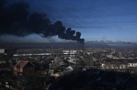 Black smoke rises from a military airport in Chuguyev, near Kharkiv, on February 24, 2022 - the first day of the Russian invasion of Ukraine. Picture: Aris Messinis/AFP via Getty Images