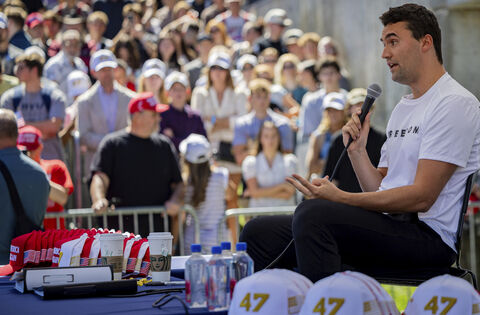 Charlie Kirk speaks before he was shot dead during an event at Utah Valley University in Orem, Utah, last Wednesday. Picture: Tess Crowley/The Deseret News via AP