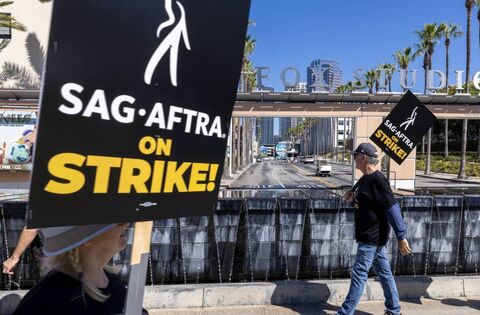 Members of the Hollywood actors SAG-AFTRA union walk a picket line with screenwriters during the actors' strike on July 14, 2023 in Los Angeles, California. Picture: David McNew/Getty Images