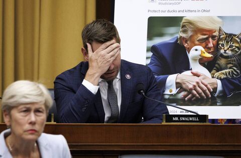 Californian Democratic Congressman Eric Swalwell reacts to a committee's tweet utilising AI- generated imagery of Republican presidential nominee Donald Trump during a House Judiciary Committee hearing on the Southern US Border on September 10, 2024 on Capitol Hill in Washington, DC. Picture: Tom Brenner/Getty Images