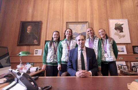 Taoiseach Simon Harris pictured in his office in Government Buildings with members of the Irish athletics team who participated in the European Championships in Rome. Picture: Sam Boal/Collins Photos