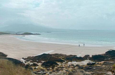 Two walkers take a leisurely stroll on the secluded beach at Silver Strand, Louisburgh, with the pristine clear waters of Clew Bay in the background. Picture: David Farrell Photography
