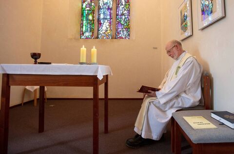 Father Laurence Flynn prays inside St Mary's Chapel at St Patrick's Purgatory on Lough Derg, on July 27, 2020, at the height of the Covid-19 lockdown. Picture: Paul Faith/AFP via Getty Images